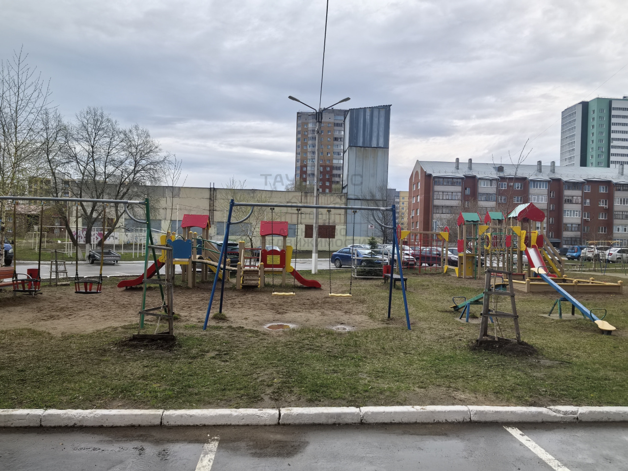 Во дворе детская площадка, просторная парковка для машин.